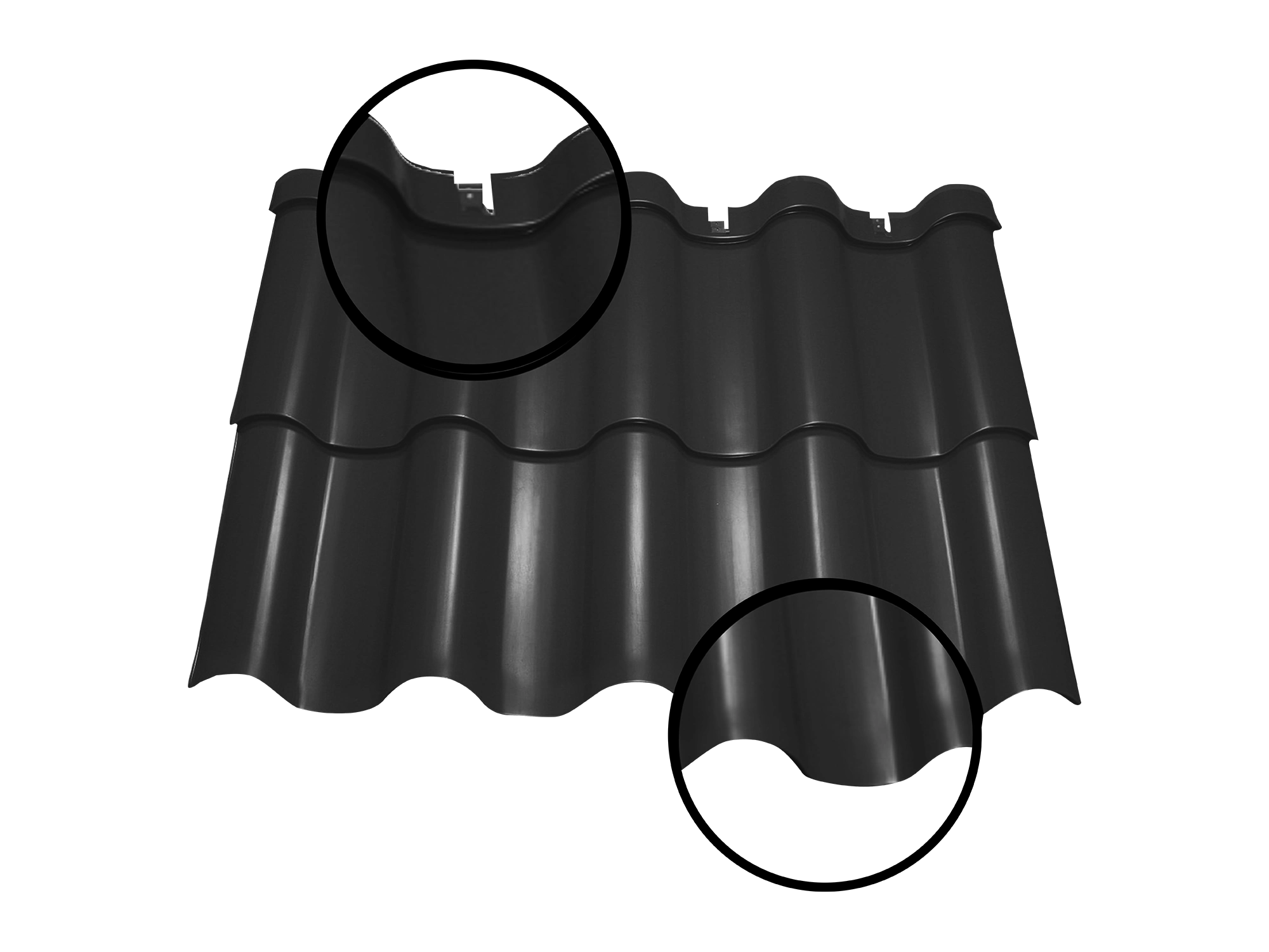 - Z-образный замок в нижней части листа способствует тому, что секции черепицы плотно прилегают друг к другу.